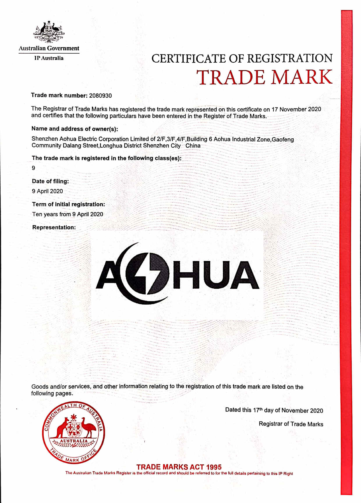 澳大利亞商標(biāo)注冊證書